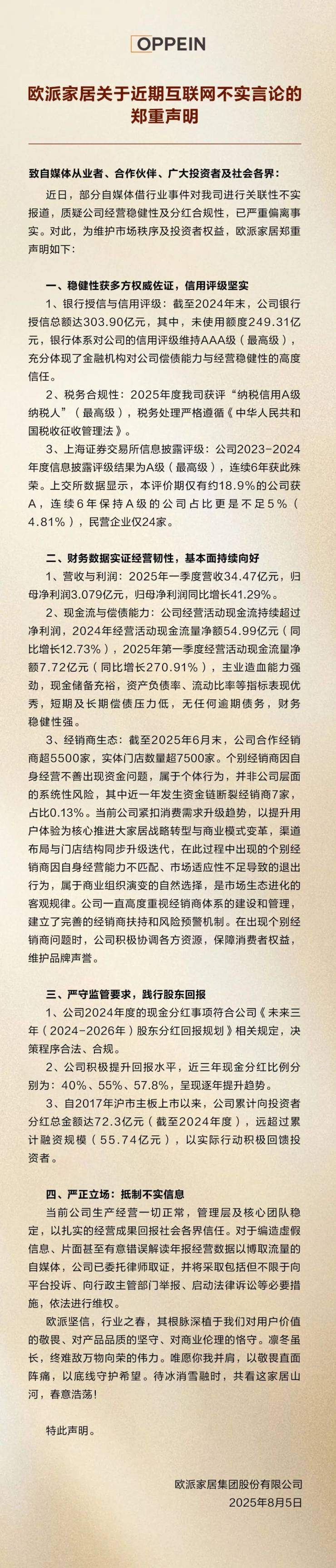 针对近期自媒体借行业波动散布“经销商资金链断裂、分红不合规”等不实信息,欧派家居8月5日发布郑重声明澄清:截至2025年6月末,公司经销商超5500家、门店超7500家,近一年仅7家经销商因自身经营问题退出,占比0.13%,属正常商业迭代…