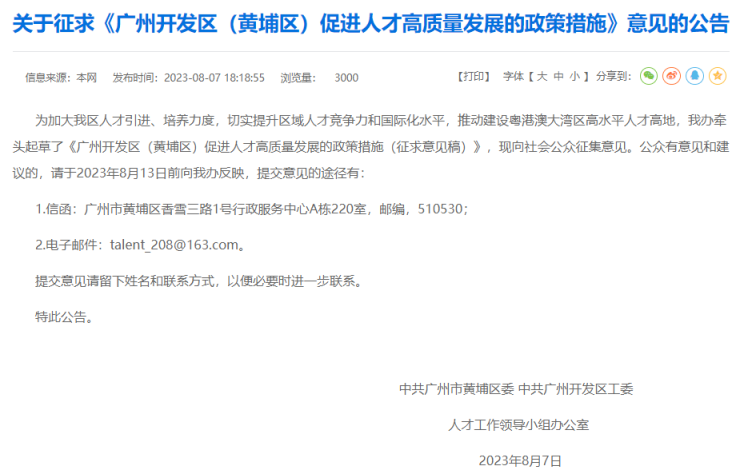近日,黄埔区政府网站上发布了关于征求《广州开发区(黄埔区)促进人才高质量发展的政策措施》意见的公告。将对多种学历、职业、职称的人才入户黄埔进行了奖励,全文如下: