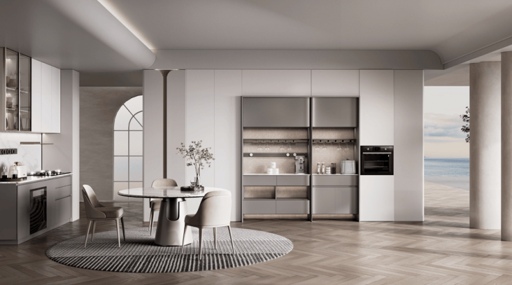 逸境系列:逸境系列将意式与东方风格完美融合,展现了轻奢大气的独特魅力。其创新的岛台咬合式设计不仅巧妙地分隔了空间,还增强了视觉层次感和互动性。柜体采用胡桃木贴皮,触感温润,低调内敛,与德国巴斯夫金属汽车漆的拉手相得益彰。细腻饱满的漆面富有光泽,进一步提升了产品的轻奢质感,成为高端厨房的不二之选。