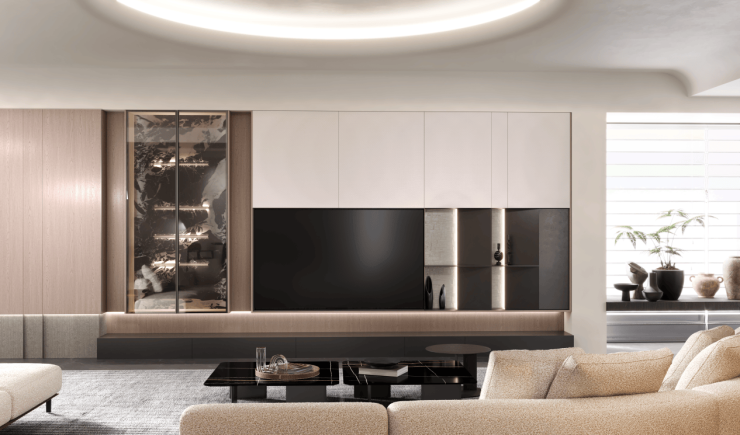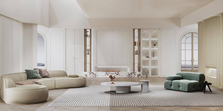 西西里系列:西西里系列定位年轻群体,以法式轻奢风格为特色。大面积白色为主色调,象征纯洁浪漫,点缀清新的浅草绿,仿佛置身于法式花园,淡雅韵味尽显。客厅展示柜采用法式圆弧造型,配以隐藏灯带,呈现若隐若现的朦胧美感,提升了整体空间的氛围感。珍珠造型的拉手设计如同少女的珍珠耳环,优雅别致,柜体四周精美的雕花点缀,结合格栅和圆弧元素,使空间更加柔美且富有层次感。