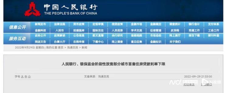 9月29日,人民银行、银保监会发布通知称,决定阶段性调整差别化住房信贷政策。符合条件的城市政府,可自主决定在2022年底前阶段性维持、下调或取消当地新发放首套住房贷款利率下限。