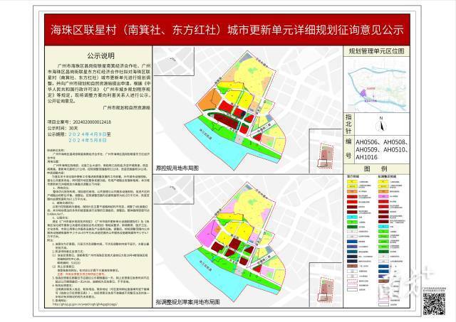 近日,《海珠区联星(南箕社、东方红社)城市更新单元详细规划》在广州市规划和自然资源局网站上进行批前公示。项目位于海珠区西南部,北接工业大道中,南临珠江后航道,东至环城高速,西至南箕路。更新单元面积127公顷,控规调整范围面积52公顷,改造范围面积24公顷。公示日期为2024年4月9日至5月8日。
