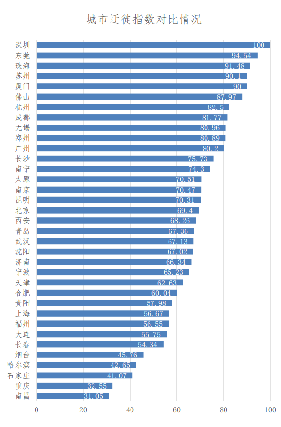 报告显示,深圳、珠海、东莞及佛山等粤港澳大湾区城市成为典型的“迁徙”城市,苏州、杭州及无锡等长三角城市紧随其后,此外,厦门及成都的迁徙指数排名也相对靠前。