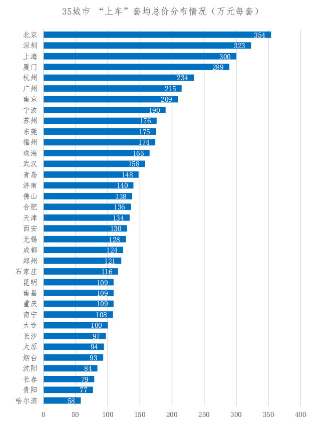 刚需“上车”套均总价300万元以上的城市一共3个,为北京、上海和深圳。更多城市集中在100万-300万区间,达25个;另有7个城市套均总价未达到100万元,以哈尔滨、贵阳、长春、沈阳及烟台为代表的城市,“上车”总价相对于其他样本城市较低。