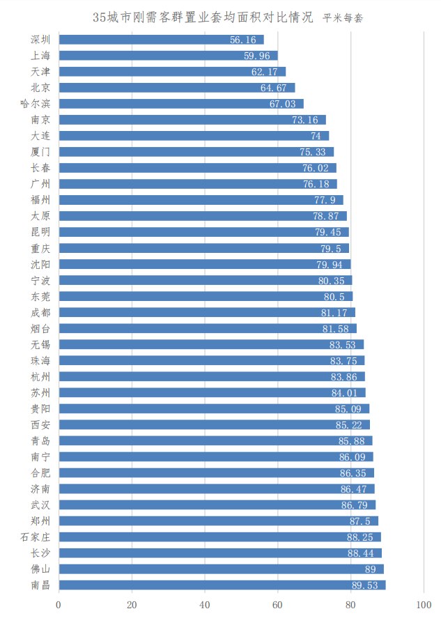 一线城市刚需置业套均面积从小到大排名为“深上北广”,4个一线城市平均住房面积约为62.31平方米。15个新一线城市的居住面积均值约为83.86平方米。16个二线城市的居住面积82.56平方米,其中居住面积较小的城市为哈尔滨、大连及厦门,居住面积较大的城市为南昌、石家庄。