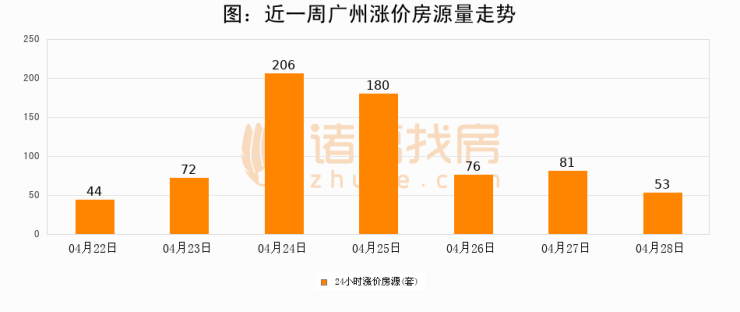 根据诸葛找房数据显示,广州24小时涨价房源量为53套,较04月27日减少28套,环比下降34.6%。与此同时,涨价房源占比小幅回落,对于购房者来说是一个入市窗口期,购房者可抓住时机入市。