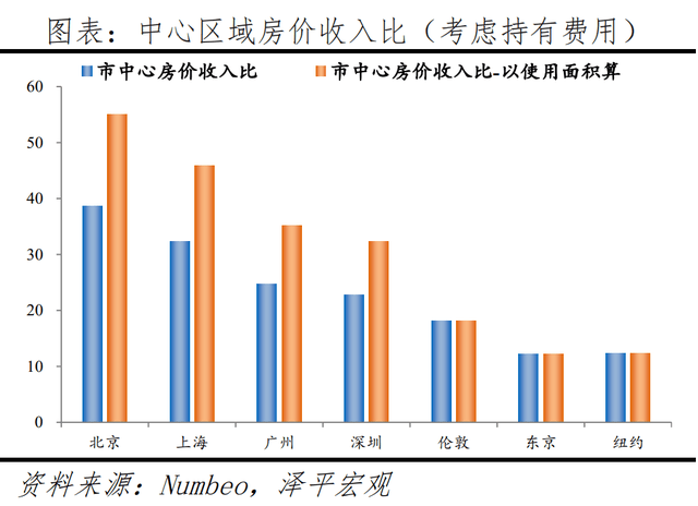 考虑到持有费用,并以使用面积算,纽约、伦敦、东京市中心房价收入比分别为12、18、12。