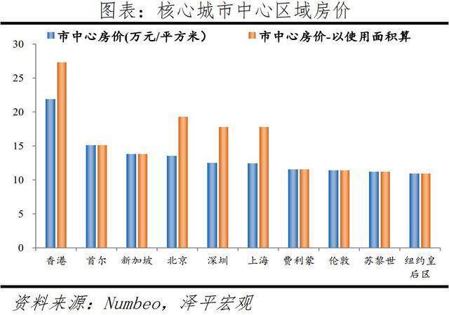 为统一口径,换算为使用面积后,全球一线城市中心区域的房价排名如下。