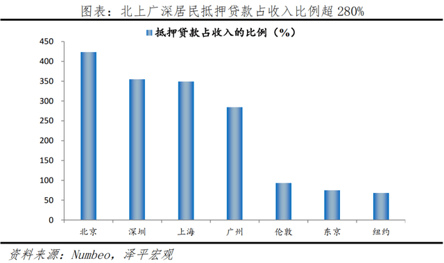 简而言之,北上广深的居民房贷压力也居世界前列,居民抵押贷款占收入比例超280%,是纽约、伦敦、东京的3-4倍。