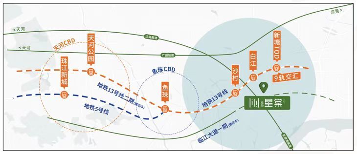 在交通上可实现1站老黄埔,1轨通达珠江新城CBD,而待13号线二期开通后,无需换乘直达珠江新城、金融城。同时,坐享十轨交汇的 “轨道高速生活圈”,速达粤港澳大湾区城市。