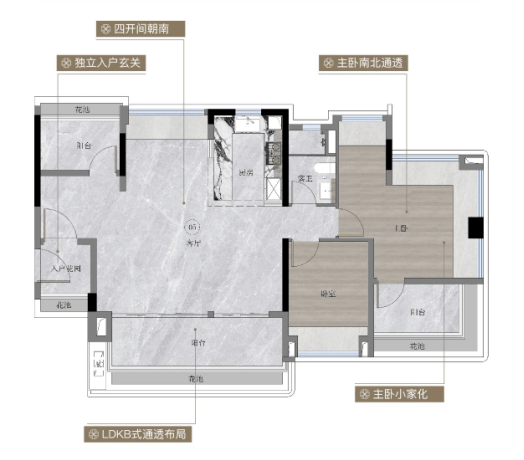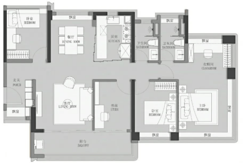 例如,越秀云悦是广州首个阳台占比达25%的超新规项目,主力户型是88㎡的3+1房和105㎡四房。以105㎡户型为例,北向次卧和主卧的部分空间以半计容的阳台报建,配合全屋飘窗和花池全赠送,最终实现34㎡的不计容面积。