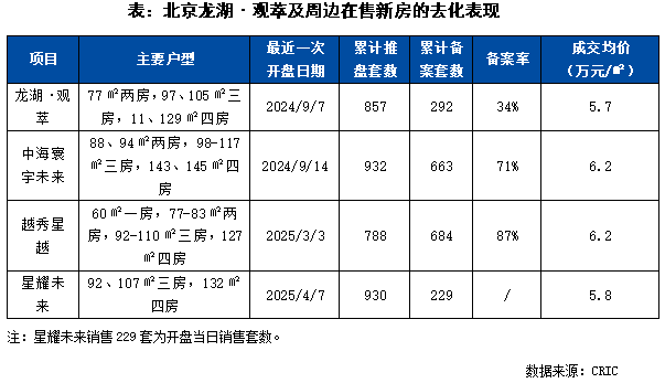 龙湖·观萃位于昌平区回龙观板块,周边三公里范围内在售的三个传统住宅项目展现出更强的市场竞争力。其中,中海寰宇未来自2024年3月底首开至今,累计推出932套房源,已完成663套备案,成交均价达6.2万元/㎡;越秀星越自2023年首开以来,经过今年3月的加推,788套房源中已备案684套,成交均价同样为6.2万元/㎡;最新入市的星耀未来,在4月7日首开当日即实现229套去化,其销售均价为5.8万元/㎡。可以看出,龙湖·观萃在成交均价低于周边竞品的情况下,去化速度也表现较弱。