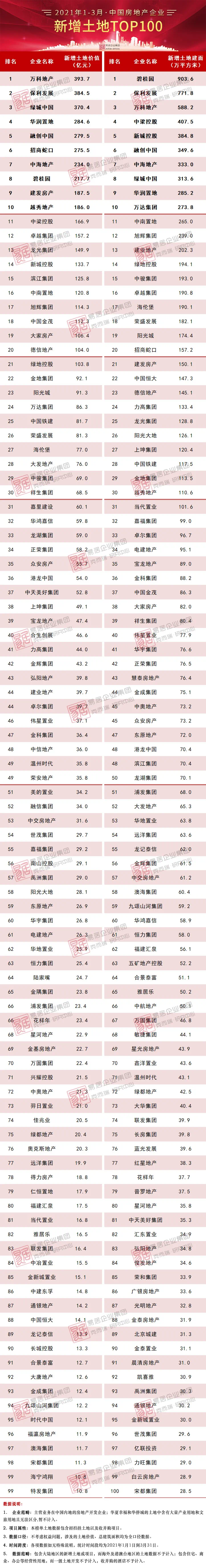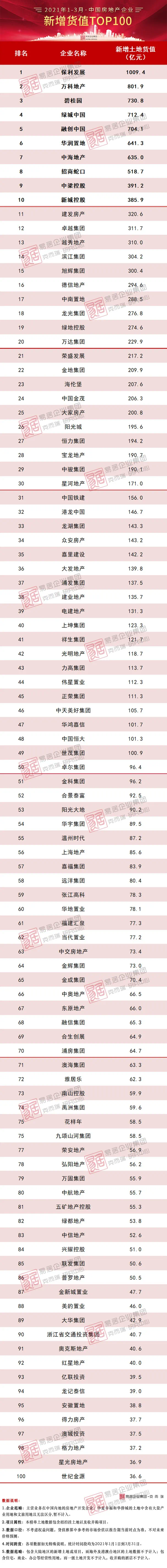 2021年一季度中国房地产企业新增货值TOP100排行榜