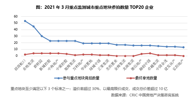 从监测的重点城市重点地块来看,3月份企业参拍重点地块次数较上月明显提升,尤其是龙头房企以及国企、央企拿地势头较强,也导致竞拍十分激烈。从部分房企参加十几宗重点地块的竞拍却仍无无斩获而言,当前土拍难度在加码。