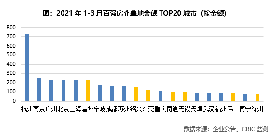 杭州成为1-3月百强房企拿地金额较高的城市,除浙系房企以外,一季度在杭州拿地的不乏万科、保利等规模房企。截止3月末,百强房企拿地金额TOP20城市中,有7个三四线城市上榜,全部为长三角和长三角的热点三四线城市。