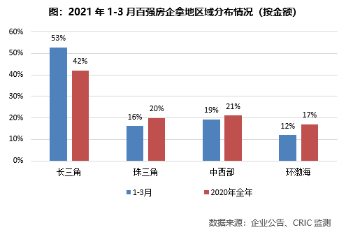 区域分布方面,长三角各能级城市均为房企投资重点,百强房企投资金额中超过一半位于长三角,较去年提升11个百分点,其次为中西部,占19%,珠三角和环渤海分别占16和12%。