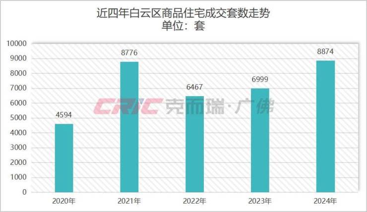 回顾历年白云商品住宅成交情况,克而瑞数据监测显示,近五年白云区商品住宅成交35710套,2024年成交规模更是达到了8874套,为近四年来最高位。
