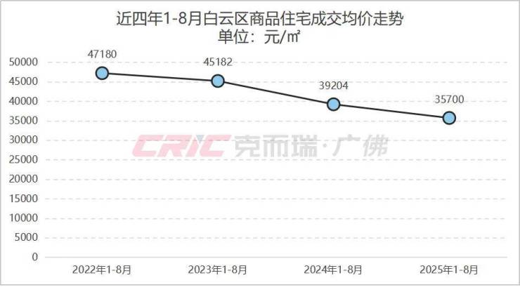 价格方面,克而瑞数据监测显示,今年1-8月白云区商品住宅成交均价35700元/㎡,同比回落9%。