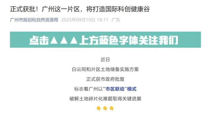 近日,广州自规局宣布,白云同和片区土地储备实施方案于近日正式获市政府批复。