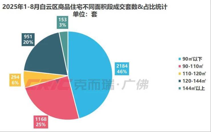 反映在面积段上,克而瑞数据监测显示,今年1-8月白云区商品住宅成交主力面积段为90㎡以下,共成交2184套,占比46%,较去年同时期增长2%。