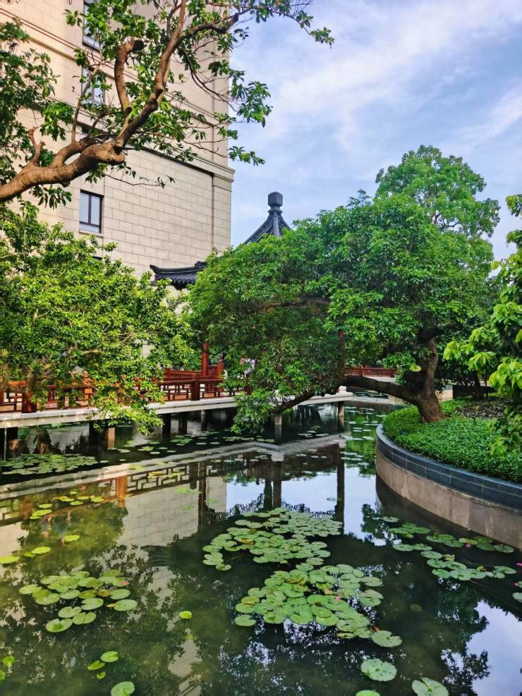 沿园林连廊徐行,一幅诗意流淌的东方画卷徐徐展开:荷塘莲池碧波荡漾,飞檐斗拱错落有致,潺潺流水与灵动绿植相映成趣,竖琴与琵琶的悠扬旋律随步履流转,将东方园林的静谧与雅致展现得淋漓尽致。星河湾深耕东方美学多年,此次园林水景打造,延续了品牌对细节的极致追求,每一处景观布局都经过精心考量,将自然与建筑完美融合,让嘉宾在漫步间,沉浸式感受东方雅致生活的诗意与惬意。