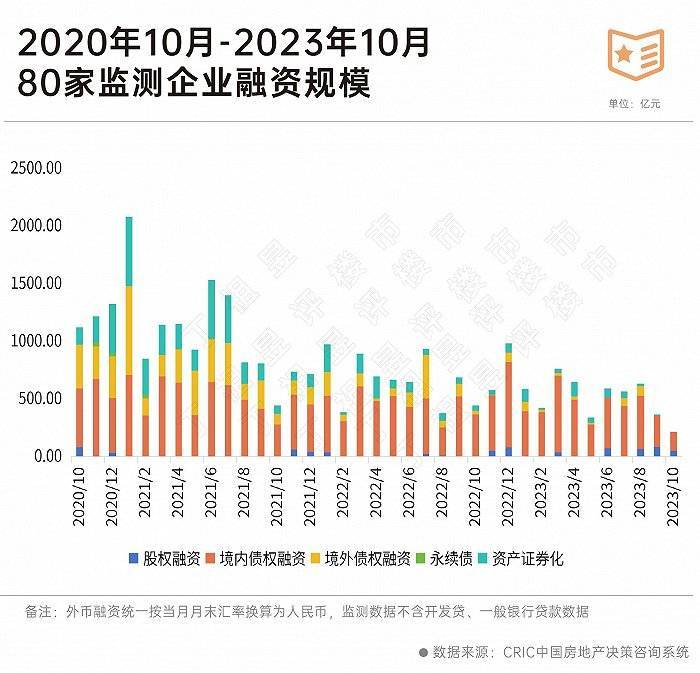 CRIC数据显示,2023年10月80家典型房企的融资总量为213.6亿元,环比减少41.5%,同比减少51.9%,创下了2020年以来的新低。