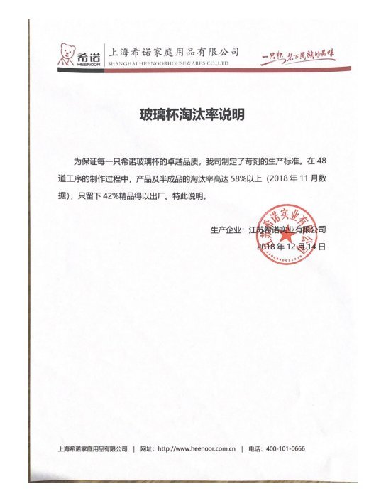 希诺玻璃杯大多工序由手工制作,经过1300度左右大火锻造,650度退火,64道工序,3重苛刻质检,每只贴上小熊标签的产品都是独特的。希诺产品以及半成品的淘汰率在2018年就达到了58%以上,用这样的玻璃杯很放心!