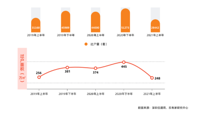乐有家研究中心数据显示,在高频加码政策下,2021年上半年深圳二手住宅市场仅过户2.8万套,环比下降45%,同比下降35%,过户量为近3年新低,过户面积仅248万平方米,调控效果十分明显。