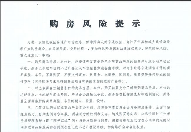 南沙住建局发布购房风险提示!禁止无证销售、伪造购房资格