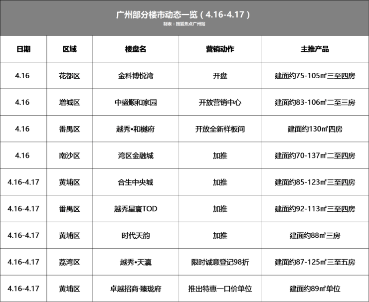 不过,本周末的楼盘动态倒是略微热闹。据搜狐焦点广州站不完全统计的9个项目营销动作来看,主要集中在加推或新开阶段。