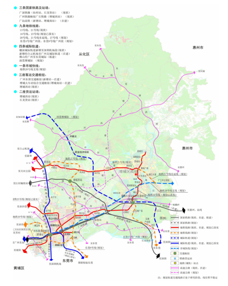 此外,官方还积极推动广汕铁路、新白广城际投入运营,启动建设地铁28号线,争取地铁16号线、23号线、21号线东延线等项目纳入近期实施计划。并加快增天高速、增莞番高速、广汕路北绕线、增莞大道、临江大道等交通主干道建设。