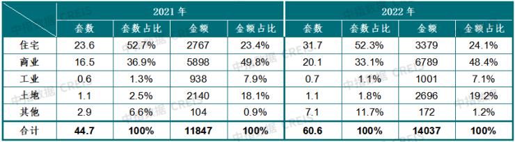 根据中指监测数据显示,从法拍房挂拍量来看,2022年,全国355个城市共挂拍86.4万套法拍房,在以同一标的物为基准进行剔除重复后,挂拍套数为60.6万套,较2021年增长35.7%,挂拍金额约1.4万亿元。从挂拍物业类型来看,2021年、2022年,住宅、商业为法拍房主流,二者合计占总拍卖套数近90%。