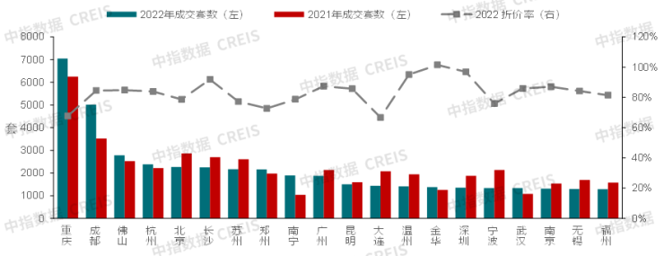 2021年、2022年成交量TOP20城市成交套数变化情况