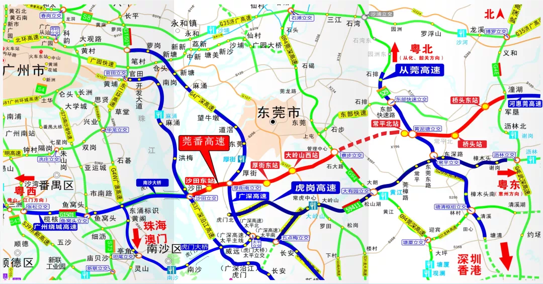广深高速至南沙大桥段为莞番高速一期,东起于广深高速,西接南沙大桥,途经厚街镇和沙田镇,长约8.2公里,已于2019年4月建成通车。