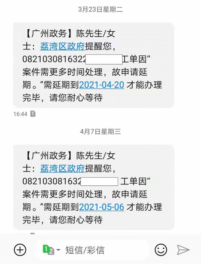 据了解,早在3月份,陈女士拨打了12345市民热线,投诉反映了此事情,荔湾区建设工程质量监督站已介入处理。此外,广州政务短信显示,由于案件需要更多时间处理,陈女士这一单投诉已被延期两次,延期到2021年5月6日才能办理完毕。