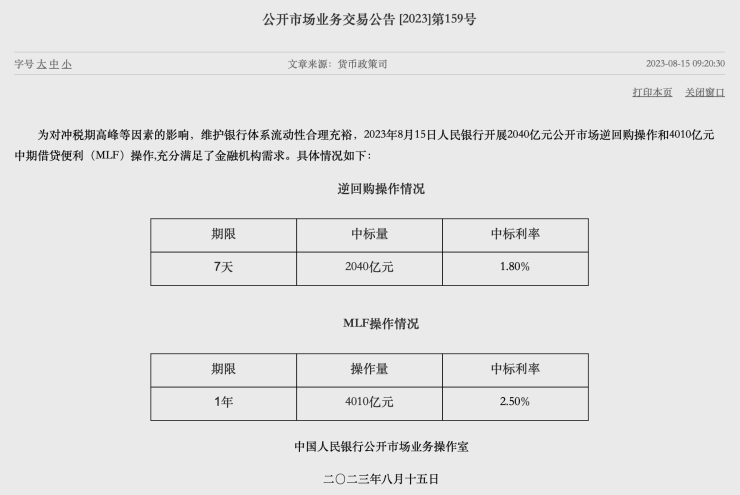 8月15日,央行公告称,为对冲税期高峰等因素的影响,维护银行体系流动性合理充裕,今日开展2040亿元公开市场逆回购操作和4010亿元中期借贷便利(MLF)操作,充分满足了金融机构需求。