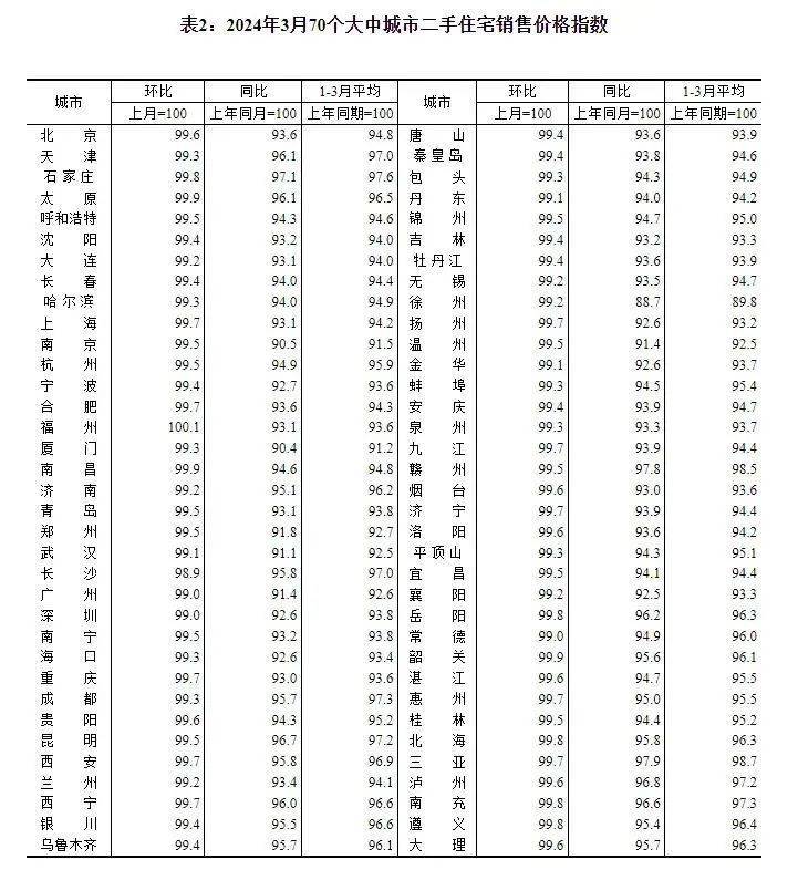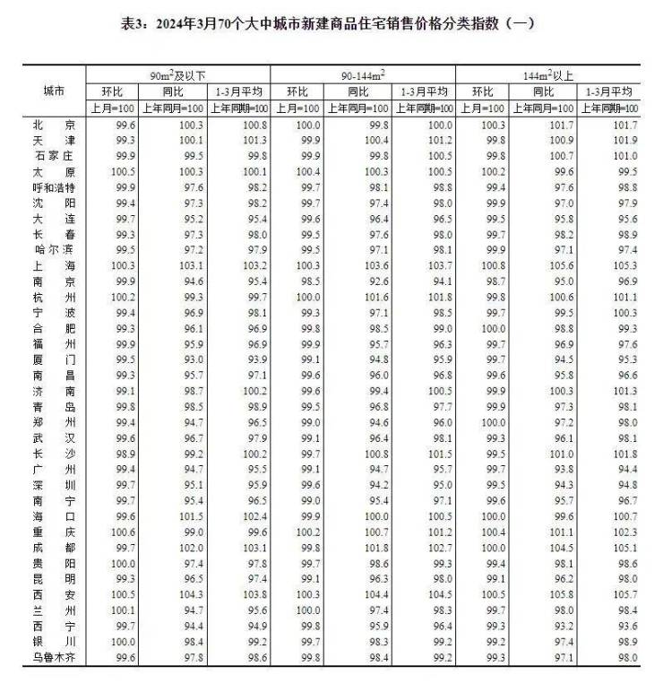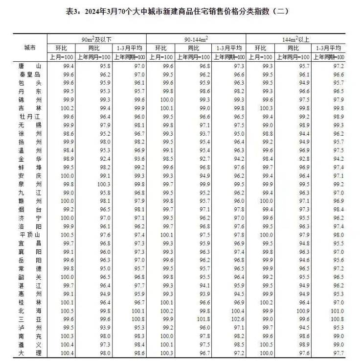 附:2024年3月份70个大中城市商品住宅销售价格变动情况