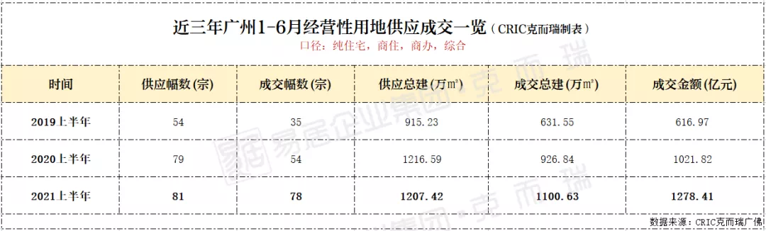 克而瑞统计到,2021上半年广州经营性用地合计供应81宗,成交78宗,其中供应总建达1207.42万㎡,,相较去年上半年微降0.8%,成交总建达1100.63万㎡,同比增加18.8%,最终成交金额达1278.78亿元,同比上涨25.1%。