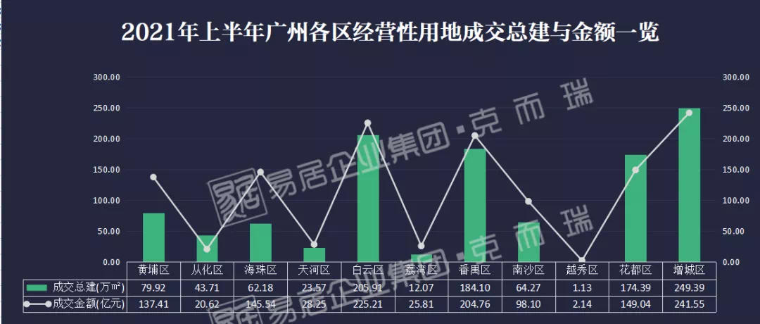 另外,从各区地块的成交总金额看,揽金超200亿元有三区,分别为白云区225.21亿元、番禺区204.76亿元、增城区241.55亿元。
