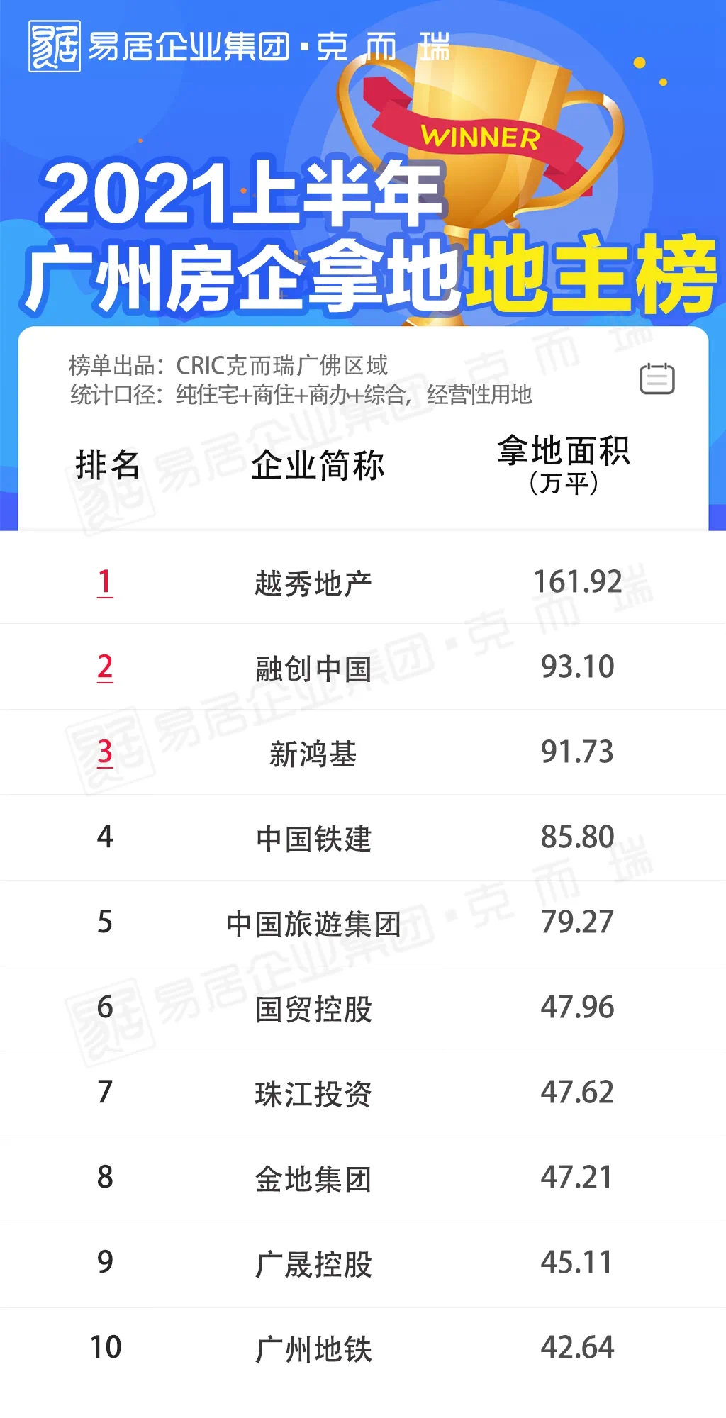 从拿地总建面积分析,越秀地产再次斩获冠军名次,以161.92万㎡登上2021半年度广州地主榜排名前列宝座;融创中国以拿地总建面积93.1万㎡紧跟其后,再之后排名第三的是新鸿基,拿地总建面积达91.73㎡。