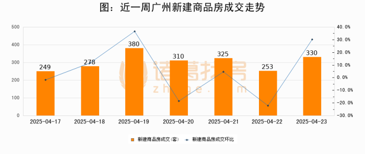 根据广州市住房和城乡建设局数据显示,2025年04月23日广州新建商品房成交330套,较昨日增加77套,环比上涨30.4%