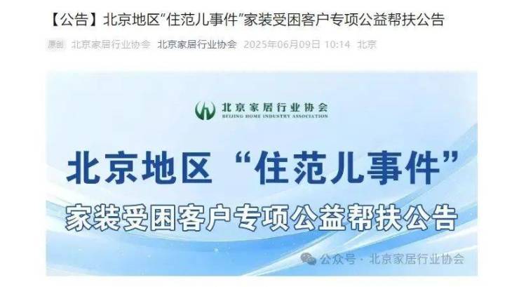 6月9日,北京家居行业协会发布“北京地区‘住范儿事件’家装受困客户专项公益帮扶公告”。针对近期引发社会各界高度关注的“住范儿事件”,协会深切理解广大家装受困客户因该事件陷入的困境,亦对行业信任度遭受的冲击深感痛惜。
