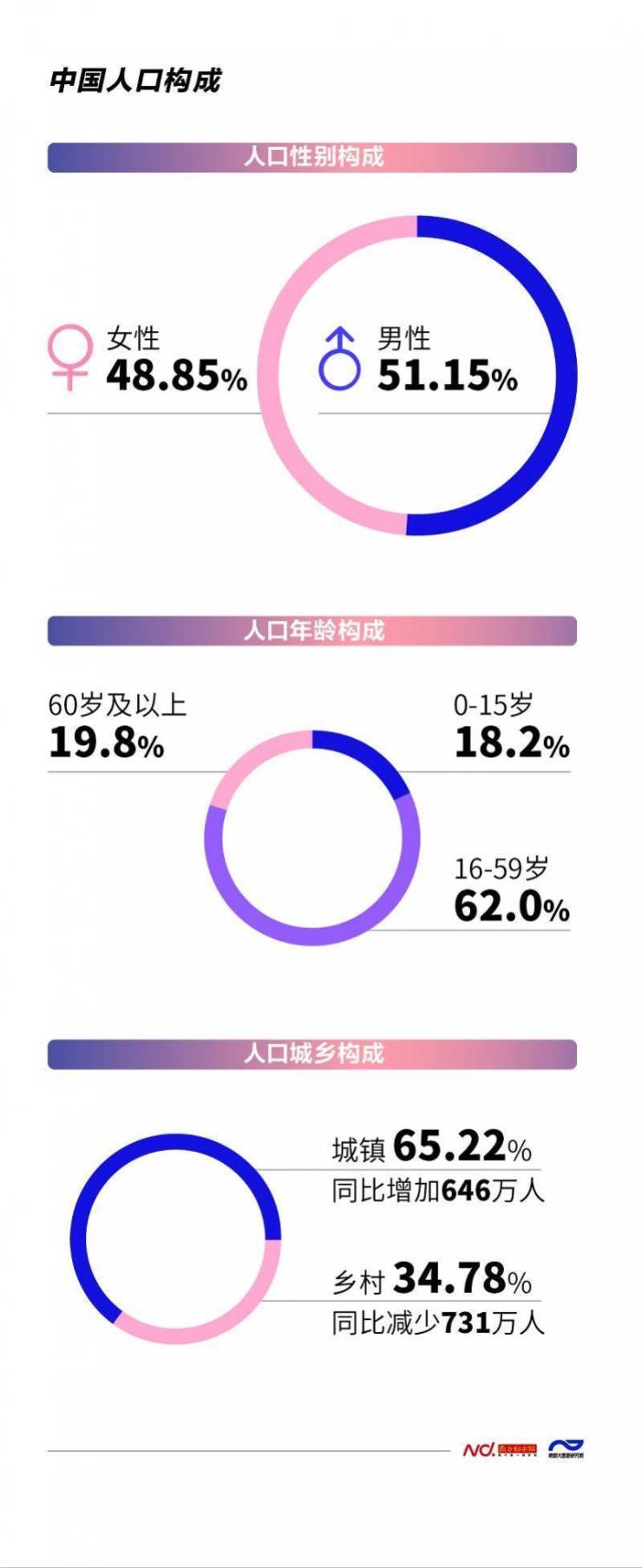 从城乡构成看,城镇常住人口92071万人,比上年末增加646万人;乡村常住人口49104万人,减少731万人。城镇化率稳步提高,为65.22%,比上年末提高0.50个百分点。