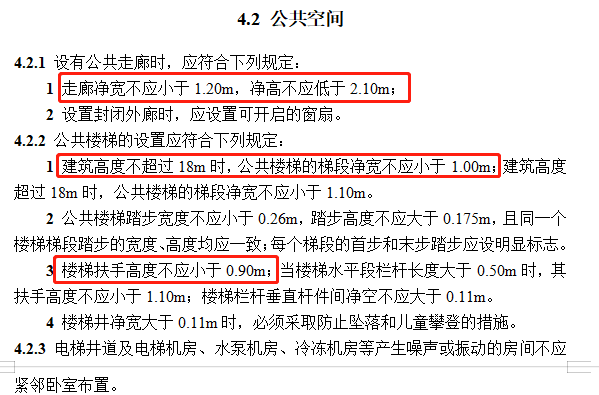 走廊净宽不应小于1.2米,净高不应低于2.1米。