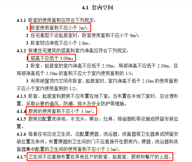 对于室内卧室、厨房、卫生间等建设,《住宅项目规范》也提出了要求,重点如下: