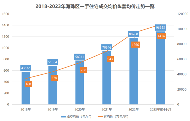 近5年,海珠区一手住宅成交均价已从43572元/㎡上升至96933元/㎡,总价均价则从460万元/套上升至1414万元/套,涨幅惊人。