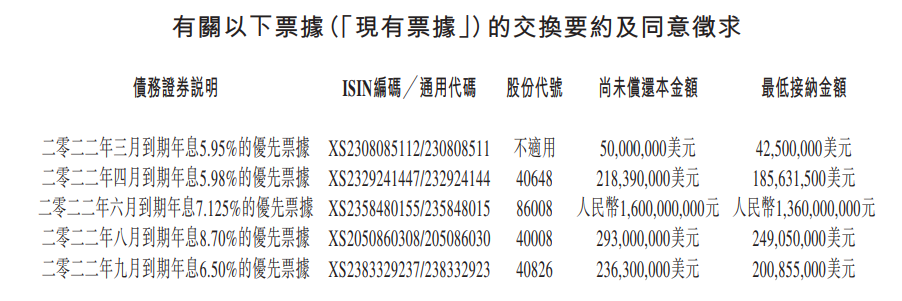 截至交换要约及同意征求备忘录日期,涉及2022年3月到期年息5.95%、2022年4月到期年息5.98%、2022年到6月期年息7.125%、2022年6月到期年息8.70%及2022年9月到期年息6.5%等多笔优先票据,合计约11.5亿美元。
