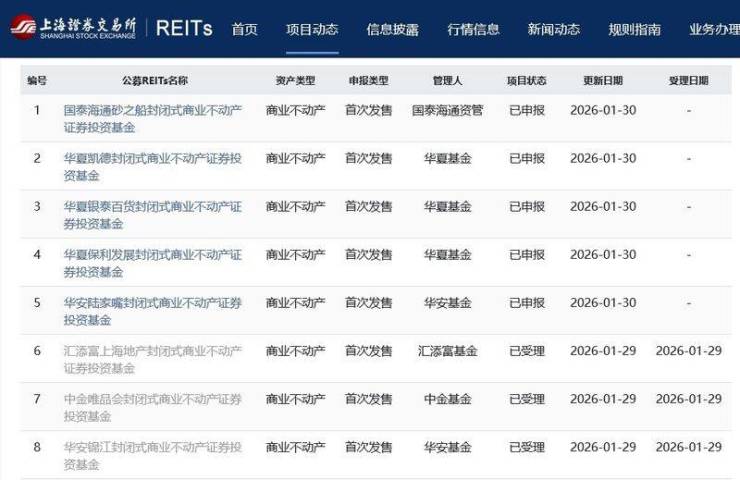 1月29日,上交所官网显示,首批申报的三只商业不动产REITs项目火速获受理预计募集总额131.75亿元。