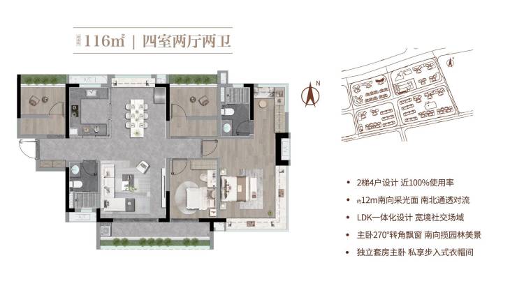 建面约116㎡户型,以270°奢卧转角飘窗,敬呈一方宽幕栖居之境,搭配步入式衣帽间,诠释着舒适生活的新境界,同时LDK一体化厅堂设计,满足大场面会客的阔居排场。