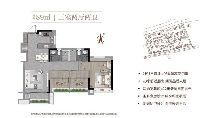 其中建面约89㎡户型,是市场少有的“四面宽、全南向”大三房户型,南向采光面约可达到12米,真正做到室室通透采光。且搭配约3米层高,约95%超高使用,整体呈现出全明、朗阔的空间格局。